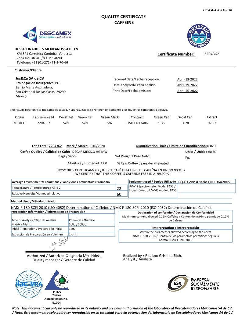 멕시코의 가장 높은 산의 빙하에서 나온 물을 이용하여 마운틴워터 방식으로 카페인을 제거하였습니다.
